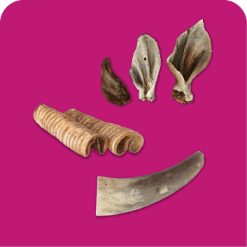 Orejas de res, patas de pollo, pezuñas, hígado, corazón y otras proteínas de verdad, sin sal ni condimentos, para satisfacer su instinto de masticar y ayudarte a complementar su dieta.
